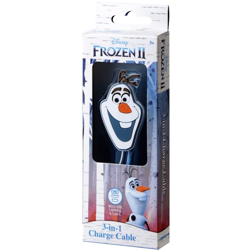 The cutest and most convenient 3-in-1 charging cable featuring Olaf for bona-fide Frozen fans. Includes connectors for Lighting, Type-C and Micro USB so you don’t need to fumble looking for the correct charger for your devices.Special Features:- Lightning, Type-C and USB Connectors- Olaf Character DesignSpecifications:- Cable length: 9CM- Material: ABS+TPE+PVC- Current: 1.5A/2AWhat’s in the box1x Disney 3-in-1 Charging Cable – Frozen II