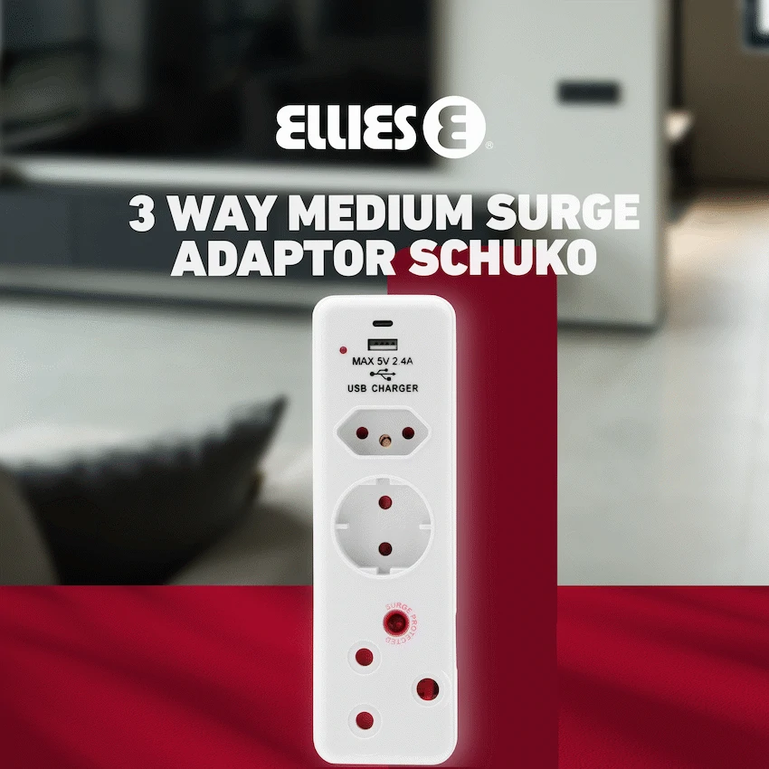 Power and protect your devices with the ELLIES 3-Way Surge Protection Adaptor with USB & Type C, your all-in-one charging and connection solution for modern homes and offices in South Africa. Designed with a sleek profile and packed with practical features, this surge protection adaptor with USB is ideal for desktops, bedside tables, or travel bags. Equipped with one 3-pin socket, one SANS 164-2 socket, and a Schuko socket with surge protection, it safely supports multiple plug types-including EU-compatible devices. It also includes dual USB charging ports (USB-A and Type-C) that deliver up to 2.4A, making it perfect for powering up phones, tablets, and other USB-powered tech. This 3 way surge plug with USB and Type C offers reliable protection with a 458J rating and 16,000A total surge current, giving you peace of mind during power spikes.