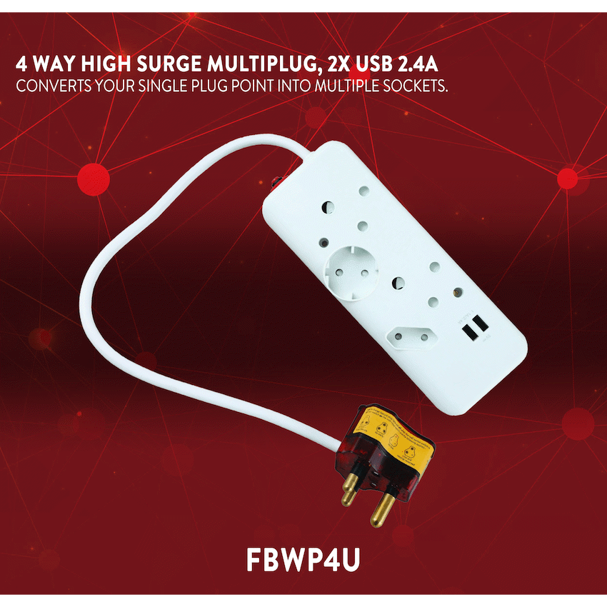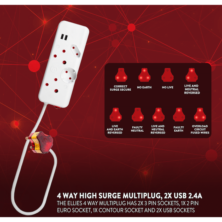 The Ellies 4 Way High Surge Multiplug offers versatile and safe power for your devices. Featuring 4 outlets – 2x 16A (3-pin), 1x 5A (Euro), and 1x 10A (Schuko) – plus 2 USB ports (2.4A total), this multplug is perfect for charging both traditional plugs and USB-powered devices simultaneously.With a 0.4-metre cable and durable 1.5mm2 thickness, it supports a maximum load of 3680W. Equipped with surge and overload protection, a reset button, and safety shutters, this multplug ensures your electronics stay safe from power issues.