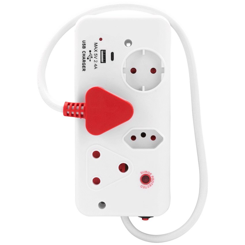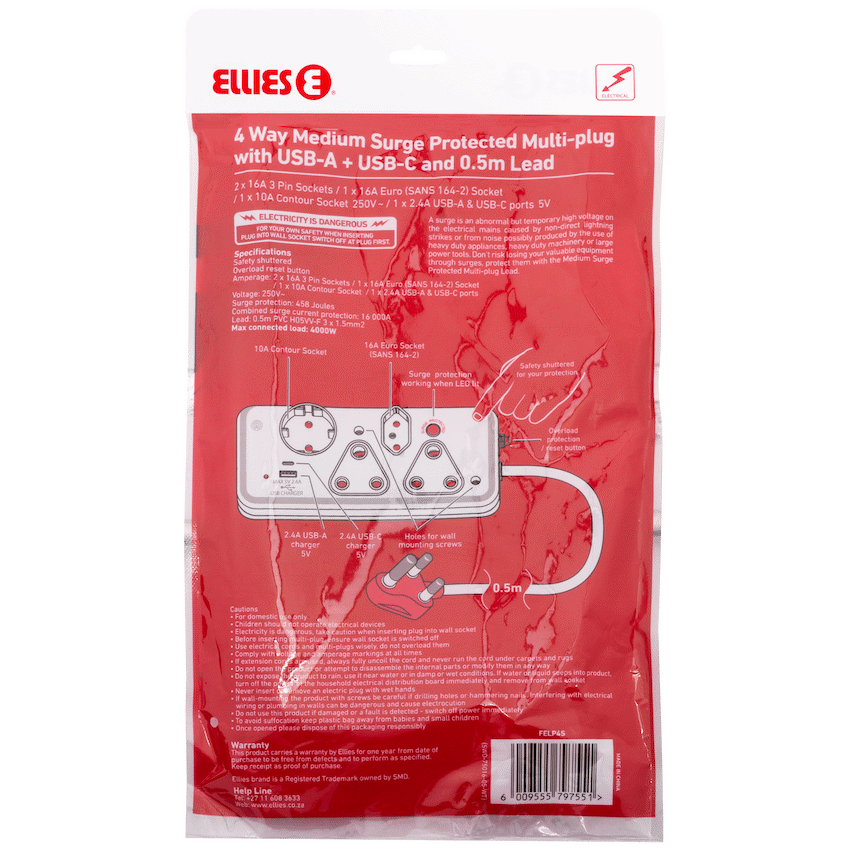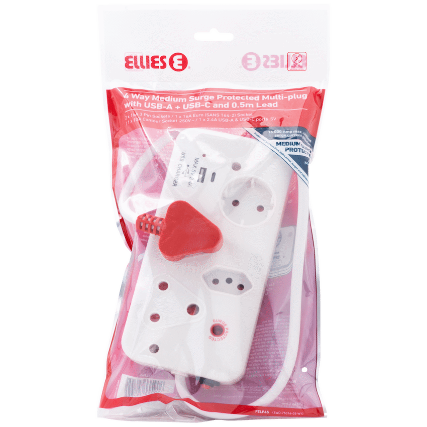 Power up safely and efficiently with the ELLIES 4-Way Surge Protection Multiplug with USB & Type C. Designed for modern South African homes and offices, this compact and convenient multiplug lets you connect multiple devices while protecting them from damaging power surges. With dedicated USB and Type C charging ports, it’s perfect for keeping your phone, tablet, and other gadgets fully charged-no extra adapters needed. Built with medium-level surge protection (458J) and an impressive 16,000A surge current capacity, it shields your valuable electronics from voltage spikes. The built-in overload protection and reset button offer an extra layer of safety, while safety shutters help prevent accidental contact, especially in homes with children. Whether you’re plugging in appliances or topping up your tech, this ELLIES multiplug makes power access simple and secure.