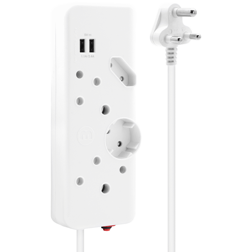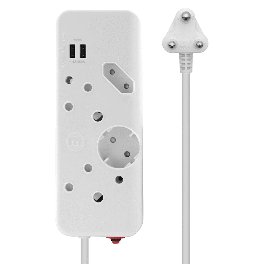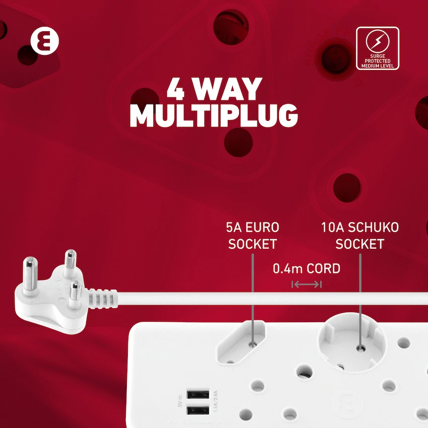 The Ellies 4-Way Multiplug with Dual USB offers a modern, all-in-one power solution for households and workspaces. With two standard 16A three-pin sockets, one 5A Euro socket, and one 10A Schuko socket, it provides versatile connectivity for a wide range of devices and small appliances.Adding extra convenience, this multiplug features two built-in 2.4A USB ports, ideal for charging smartphones, tablets, and other USB-powered devices without needing separate adapters. Its 0.4m cable with a 1.0mm thickness ensures durable, safe connections, while safety shutters add an extra layer of household protection.For added reliability, the multiplug includes an overload reset switch, safeguarding your devices from unexpected power surges. Rated at 250V, 16A, it delivers consistent performance while keeping everyday usage safe and efficient.Practical, compact, and designed for modern living, the Ellies 4-Way Multiplug is the smarter way to power and charge multiple devices at the same time.What’s in the Box:1 x Ellies 4-Way Multiplug with Dual USB 2.4A – 0.4m White