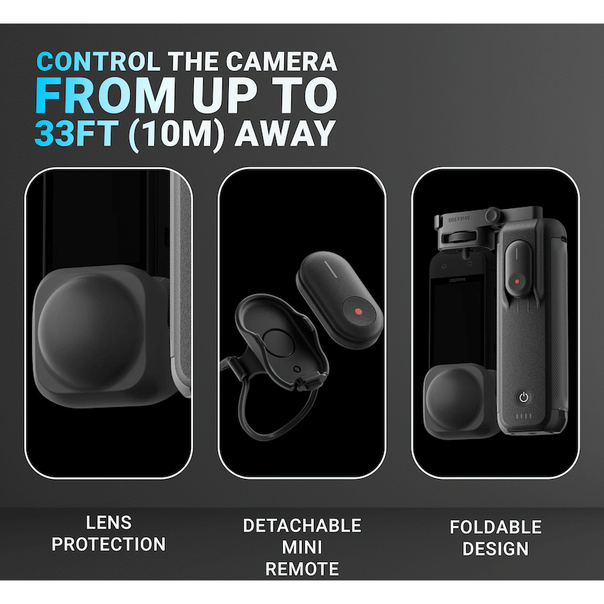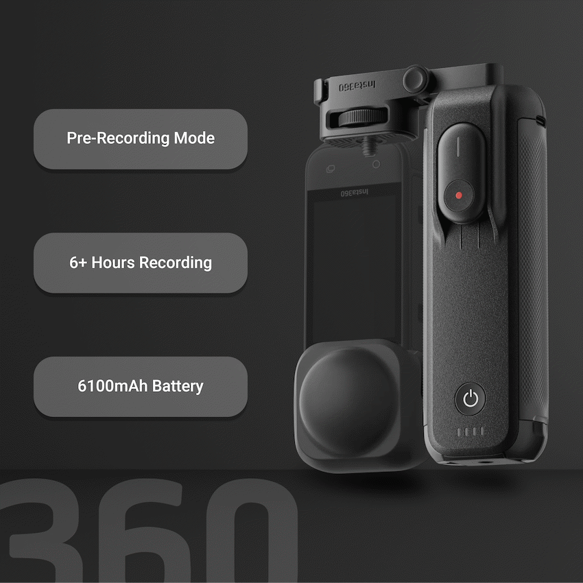 Never miss a moment with the Insta360 FOMO Power Handle, designed for the X5 and X4 cameras. Featuring a built-in 6100mAh battery, it provides over 6 hours of continuous 5.7K30fps recording in Pre-Recording Mode, ensuring you capture every spontaneous 360deg shot. The handle includes a detachable Bluetooth Mini Remote with up to 33ft (10m) range for convenient camera control from a distance. Its compact, foldable design makes it easy to carry, while the included lens cap protects your camera during transport.