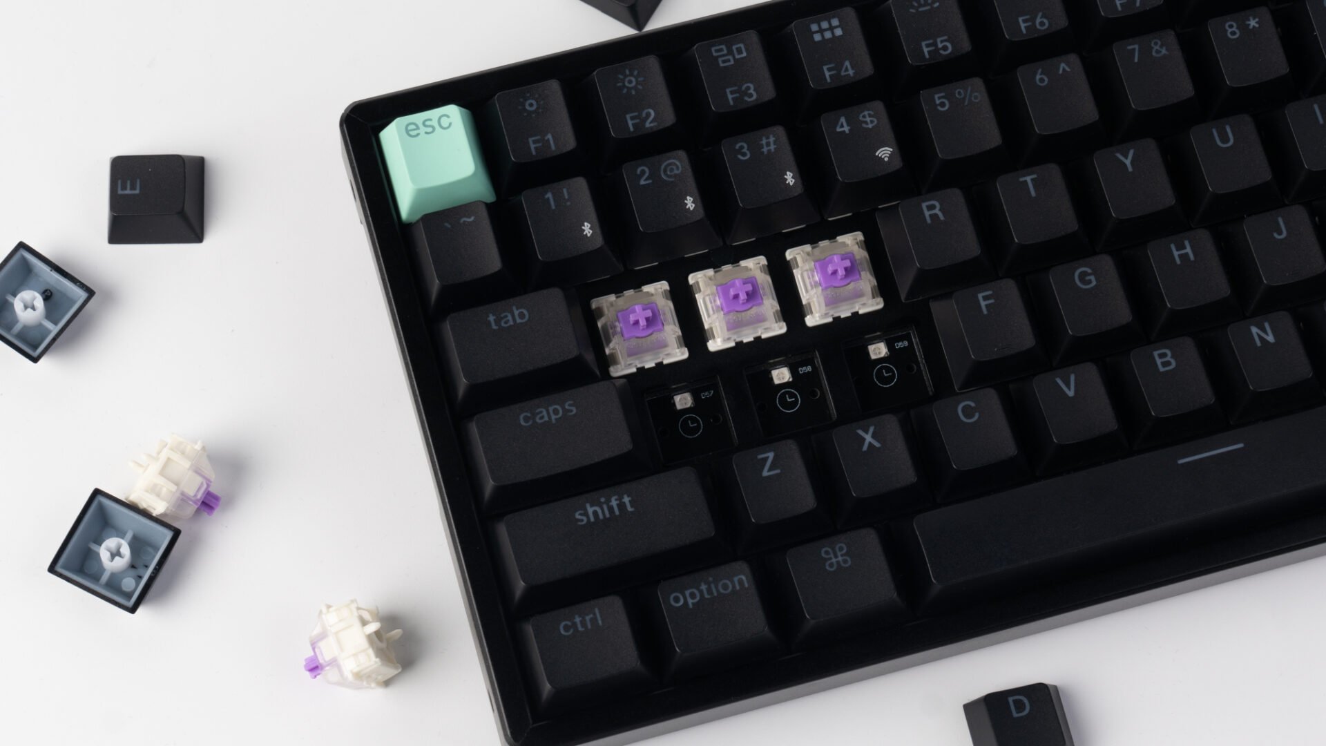 - Includes hot-swappable sockets, allowing easy switch changes without soldering.