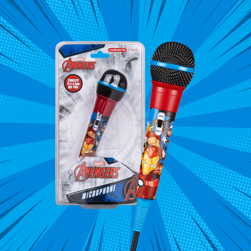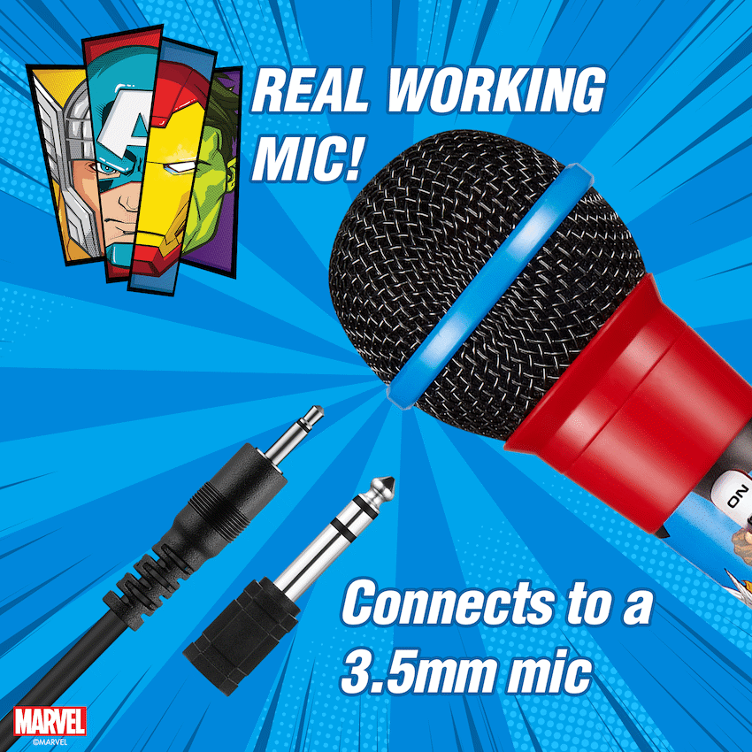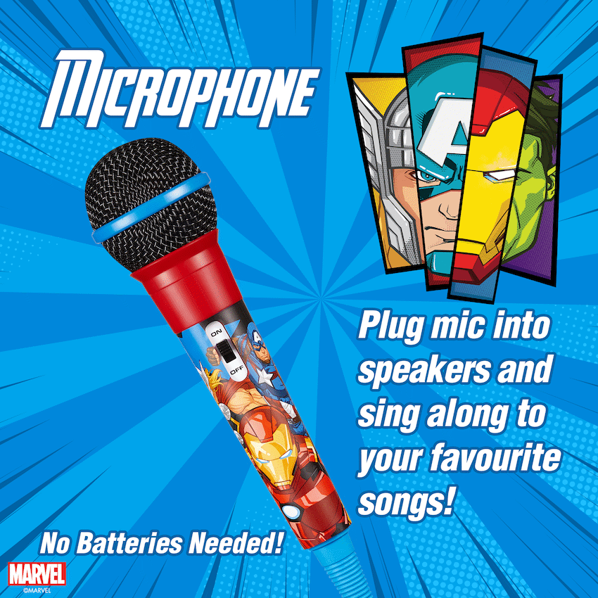 Take centre stage with the Avengers auxiliary microphone, designed for kids and fans who love to sing, perform, or roleplay as their favourite superheroes! The Marvel 11201 Series Auxiliary Microphone delivers a fun, authentic singing experience with a durable design and vibrant Avengers theme.With its 3m extra-long cable, kids can move freely while performing, and the 3.5mm Aux connection ensures compatibility with most karaoke machines, speakers, and audio devices. The included 6.5mm adapter expands connectivity even further, making this mic versatile for different setups.Whether it’s a birthday party, family karaoke night, or superhero roleplay session, this Avengers mic is built to keep the fun going. Lightweight, durable, and easy to use, it’s the perfect microphone for young performers and Marvel fans alike.Feature HighlightsReal Singing Experience – Designed to amplify fun performances and playAux Compatible – Works with karaoke machines, speakers, and other Aux input devicesExtra-Long 3m Cable – Gives kids plenty of room to move around while singingIncludes 6.5mm Adapter – Expands compatibility with various audio systemsAvengers Design – Bold superhero theme makes every performance excitingTechnical SpecificationsMaterial: PlasticMicrophone Cable Length: 3mMicrophone Sensitivity: 72dBMax Sound Pressure Level: 120dBRating: 1.3V ? 0.03WAux Adapter: 3.5mm to 6.5mmWhat’s in the BoxMarvel Avengers Auxiliary Microphone6.5mm Aux AdapterSing, play, and perform like a superhero with the Avengers auxiliary microphone – built for fun, durability, and endless entertainment!