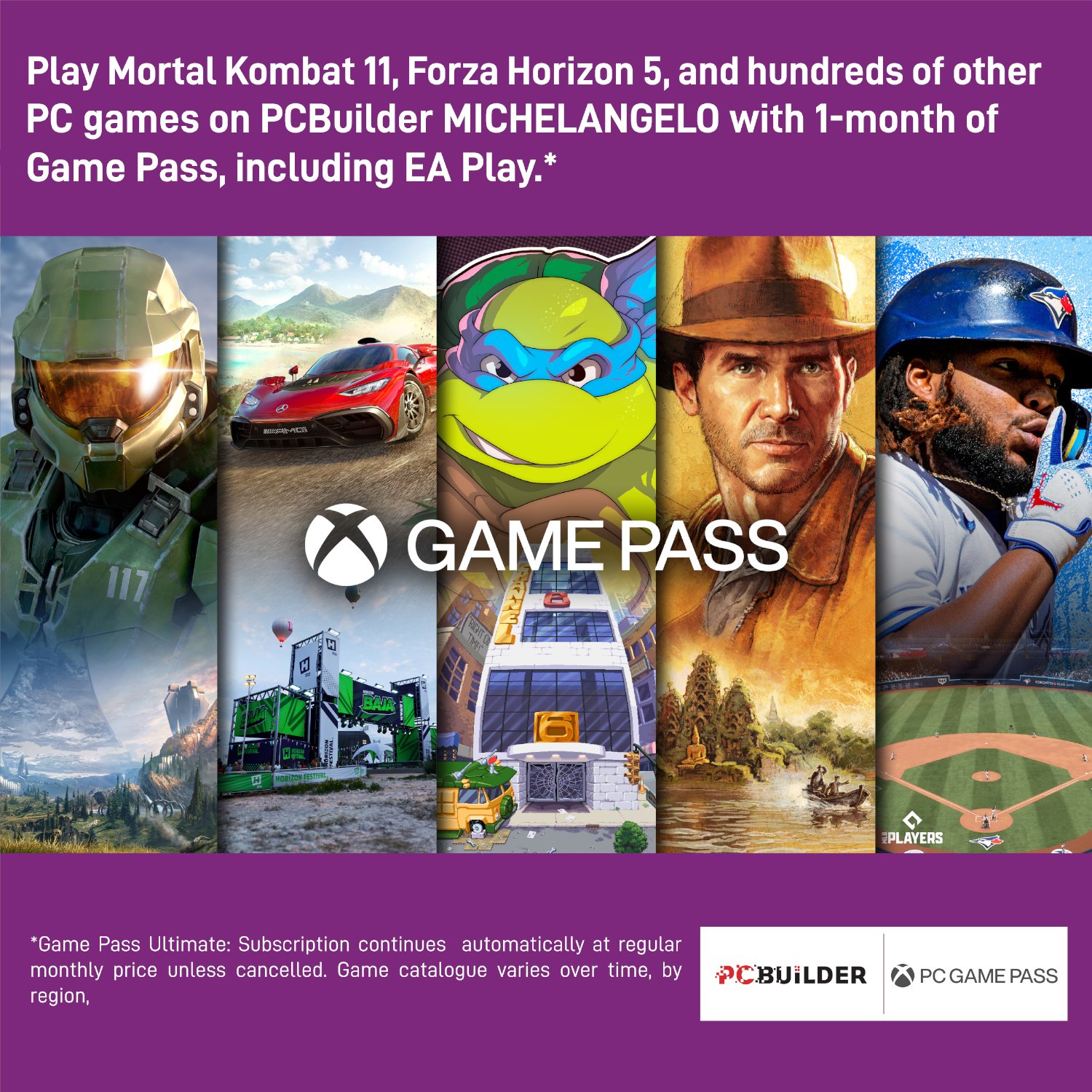 - Play over 100 high-quality PC games like Halo Infinite, Forza Horizon 5 and Teenage Mutant Ninja Turtles: Shredder’s Revenge with your new build and one month of PC Game Pass including EA Play. With new games being added all the time, there’s always something new to play from day one.​