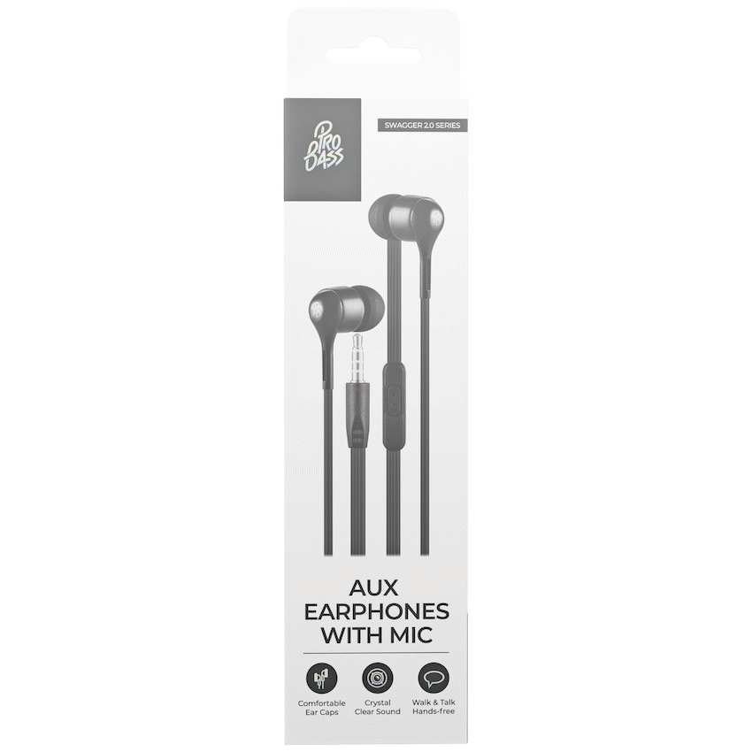 Experience rich, full-range audio with the Pro Bass Swagger 2.0 Series Aux Earphones with Mic – Black. Designed for everyday listening, these budget-friendly earphones deliver crisp and balanced sound quality whether you’re commuting, working, or relaxing. With a built-in microphone, you can take calls or activate voice commands without reaching for your phone-making them ideal for hands-free communication on the go.The 10mm drivers bring out detail in every track, while the 120cm cable provides ample length for comfortable movement. Whether you’re plugged into your phone, laptop, or tablet, the 3.5mm aux connection ensures broad compatibility across most devices. The Pro Bass Swagger 2.0 Series is the perfect choice for shoppers seeking Pro Bass earphones with clear audio and everyday functionality at an unbeatable price.Feature Highlights:Full-Range Sound – Enjoy clear, balanced audio across all frequenciesHands-Free Calling – Built-in mic supports calls and voice controlComfortable Length – 120cm cable offers freedom of movementBudget-Friendly Design – Great value without compromising on soundWide Compatibility – Standard 3.5mm aux plug fits most devicesTechnical Specifications:Impedance: 32?Frequency Range: 20Hz – 20kHzSensitivity: 95dB +/-5dBDriver Size: 10mmCable Length: 120cmWhat’s in the Box:Pro Bass Swagger 2.0 Series Aux Earphones with MicStay connected and enjoy clear, hands-free sound-wherever life takes you.
