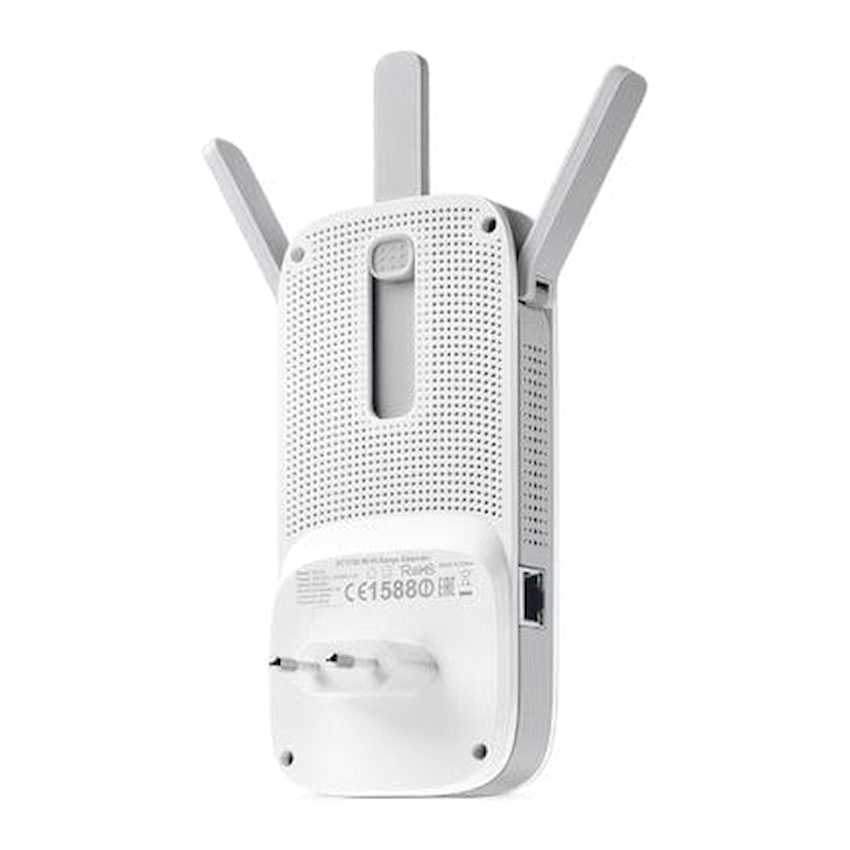 TP-Link RE455 AC1750 Wi-Fi Range ExtenderMaximum Coverage – Extend Wi-Fi coverage by up to 1,115 m2(12,000sq. ft).AC1750 Dual Band Wi-Fi – Simultaneous 450Mbps on 2.4GHz + 1300Mbps on 5GHzThree Antennas – Three adjustable external antennas provide optimal Wi-Fi coverage and reliable connectionsGigabit Ethernet port – Act as a wireless adapter to connect a wired device to your network at Gigabit speedIntelligent Signal Light – Help to find the best location for optimal Wi-Fi coverage by showing the signal strengthAP Mode – Create a new Wi-Fi access point to enhance your wired network with Wi-Fi capabilityTP-Link Tether App – Easily access and manage your network using any iOS or Android mobile deviceUltimate Compatibility – Extend the range of any Wi-Fi router or wireless access point